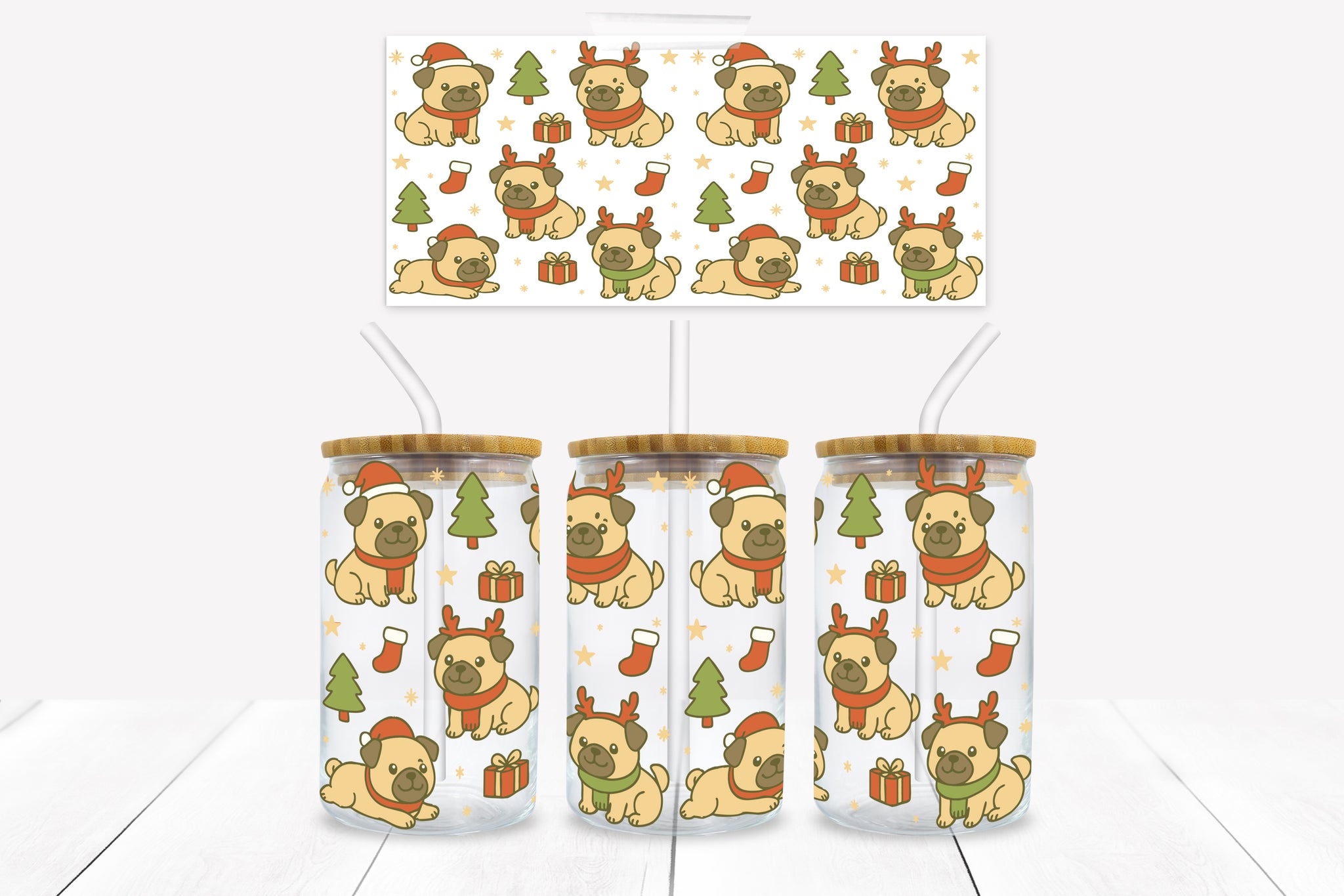 UVD 182 Christmas Pug - 16 oz Glass Cup Wrap